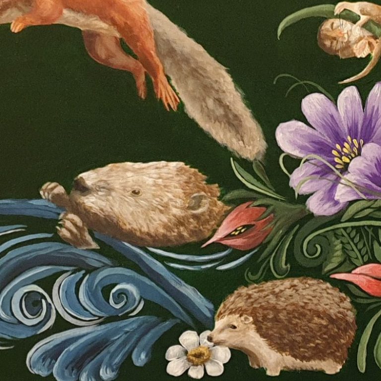 A painting honouring endangered woodland creatures, blending traditional canal-barge motifs with the fragile beauty of species at risk.