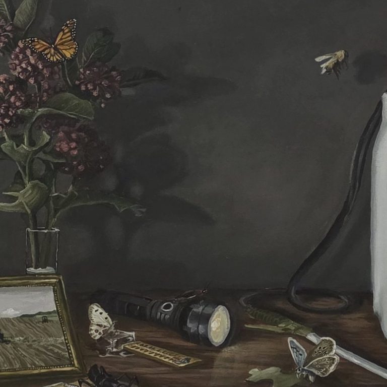 Inspired by traditional still life, this piece portrays the fragile world of insects and the threats they face from pollution to harmful pesticides.