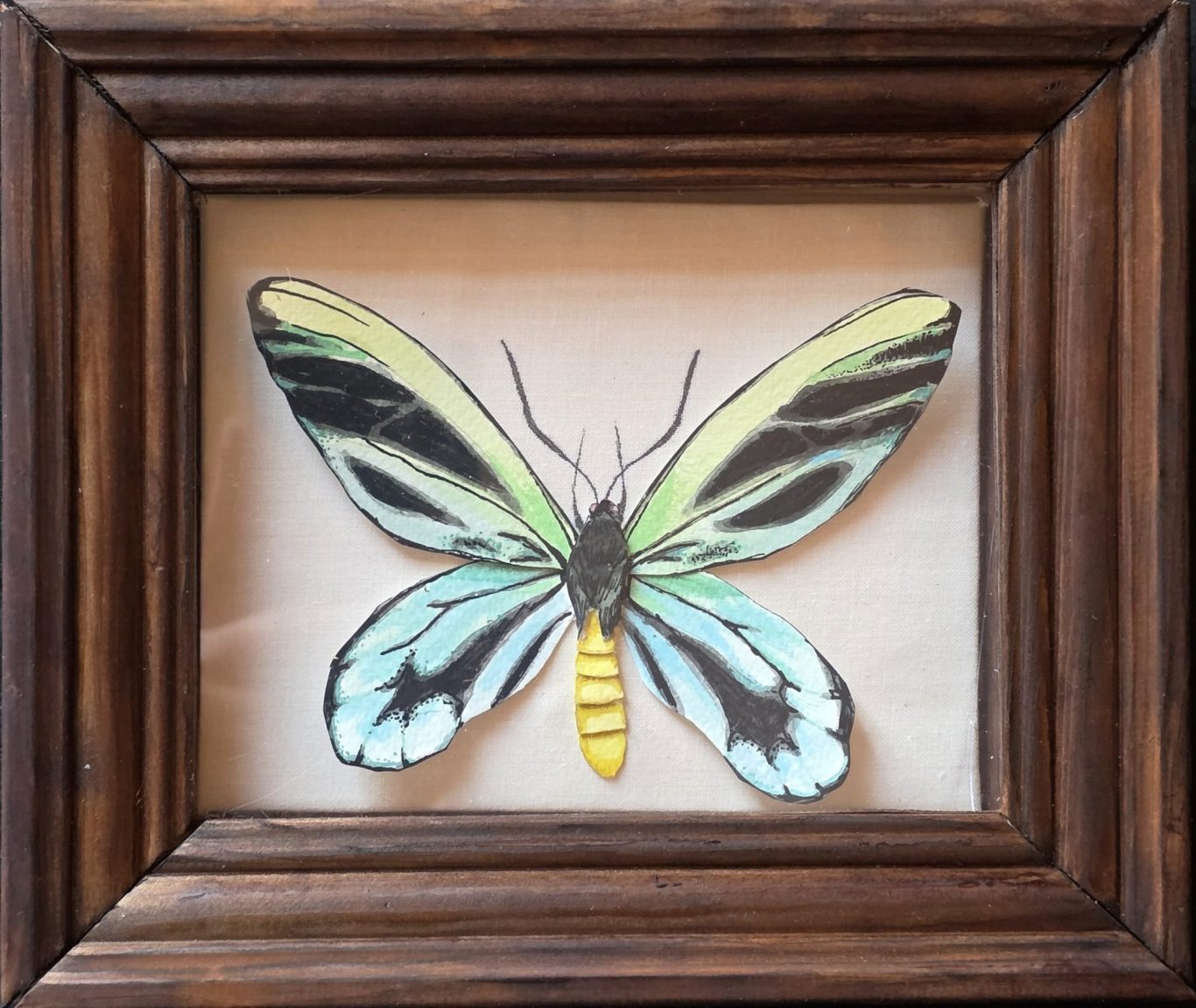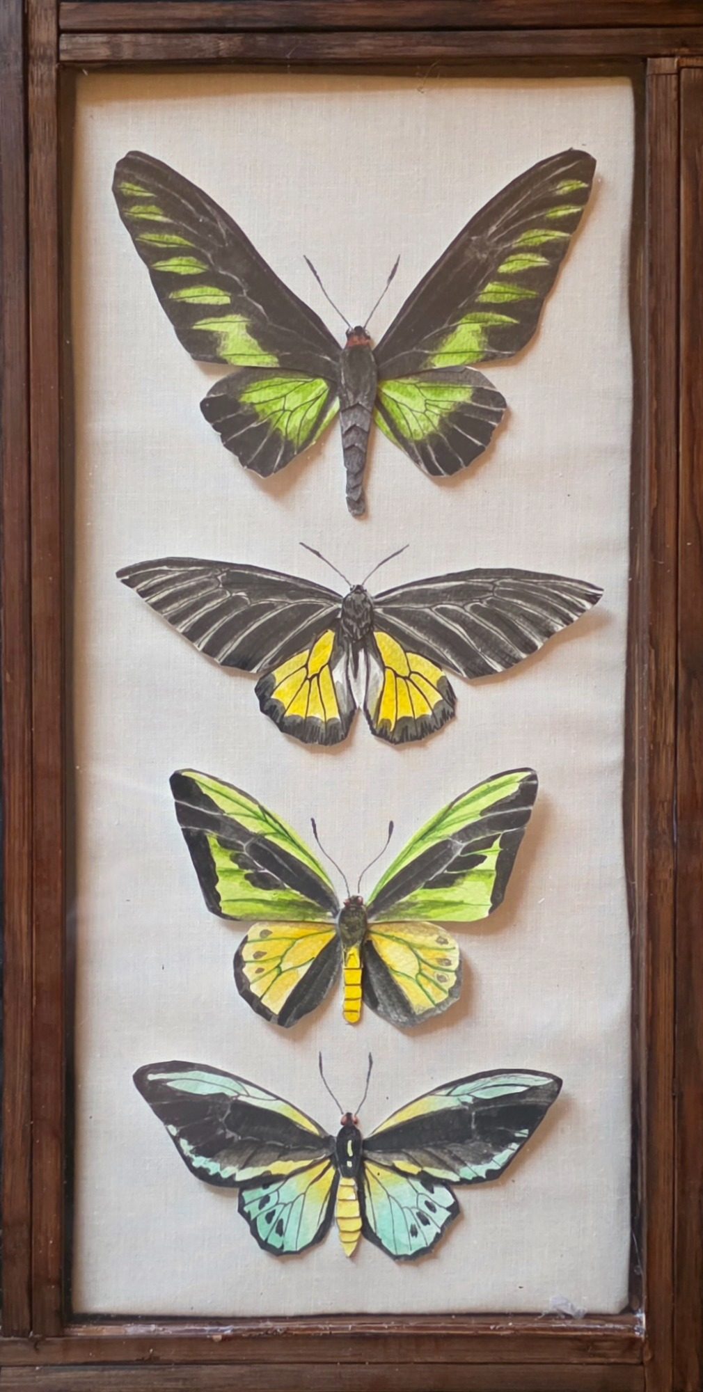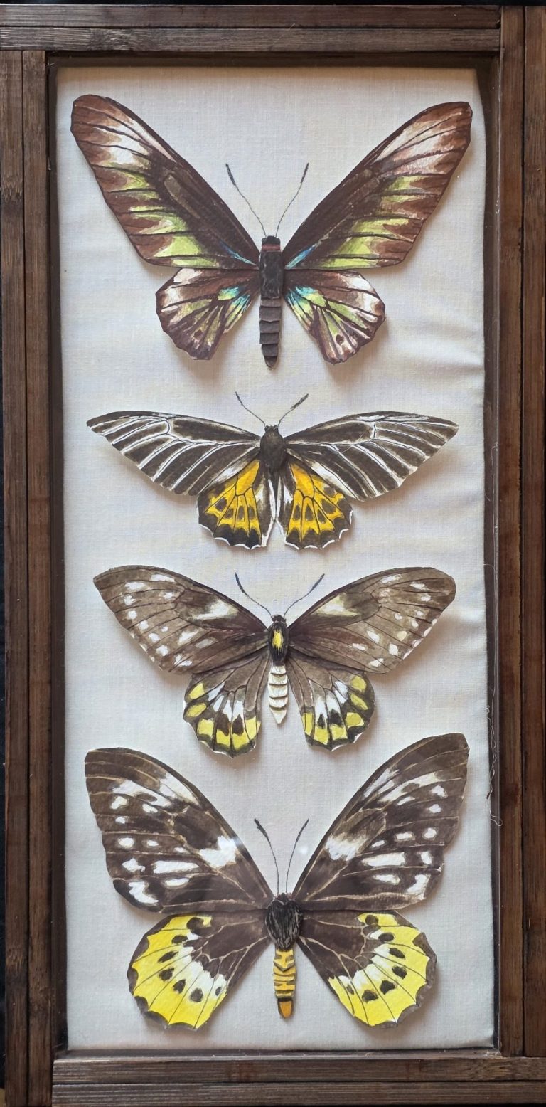 Alongside this, another small series within the collection focuses on birdwing butterflies, featuring both male and female specimens affected by deforestation. These works are presented in box frames designed to resemble pinned butterfly displays, further reinforcing the visual language of preservation and classification. By placing these vibrant yet vulnerable species within a controlled, archival-like format, the series emphasizes the tension between beauty, conservation, and loss.