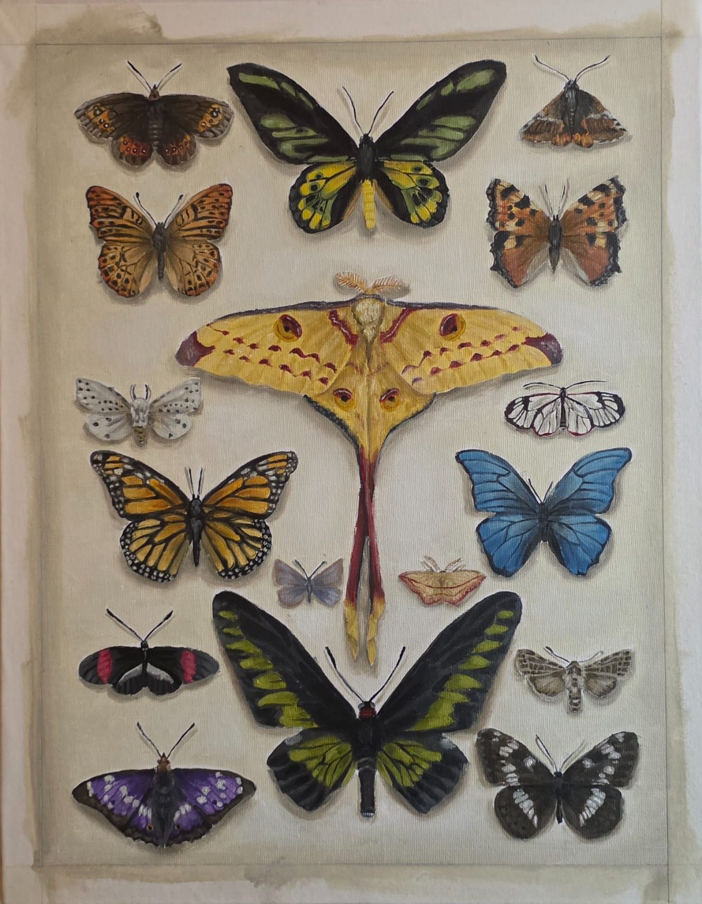 Creatures of a Fading Forest is a small painting series focused on insects affected by deforestation. The works depict each insect as if pinned, referencing traditional entomological displays and taxidermy practices.